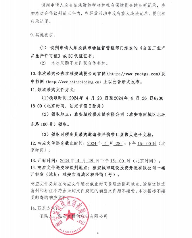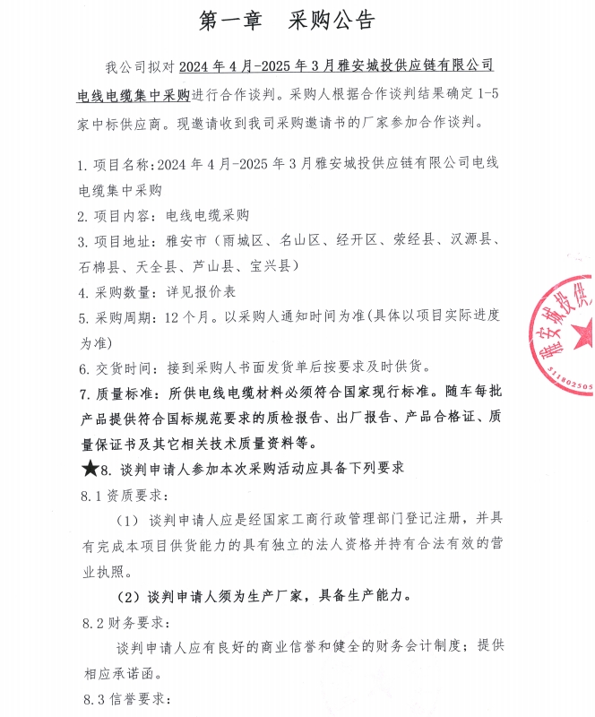 2024年4月-2025年3月雅安城投供應(yīng)鏈有限公司電線(xiàn)電纜集中采購(gòu)公告