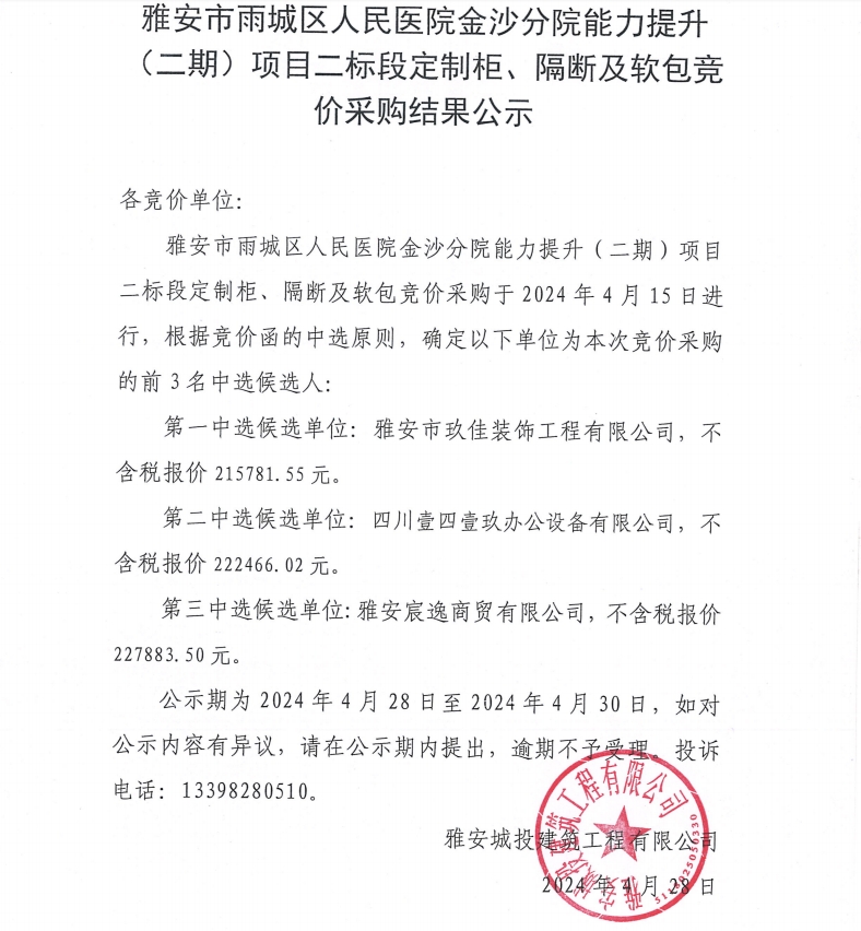 雅安市雨城區(qū)人民醫(yī)院金沙分院能力提升(二期)項(xiàng)目二標(biāo)段定制柜、隔斷及軟包競(jìng)價(jià)采購結(jié)果公示