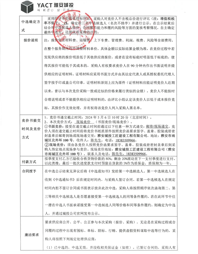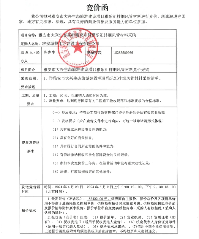 雅安市大興生態(tài)旅游建設(shè)項(xiàng)目雅樂(lè)匯排煙風(fēng)管材料采購(gòu)競(jìng)價(jià)公告