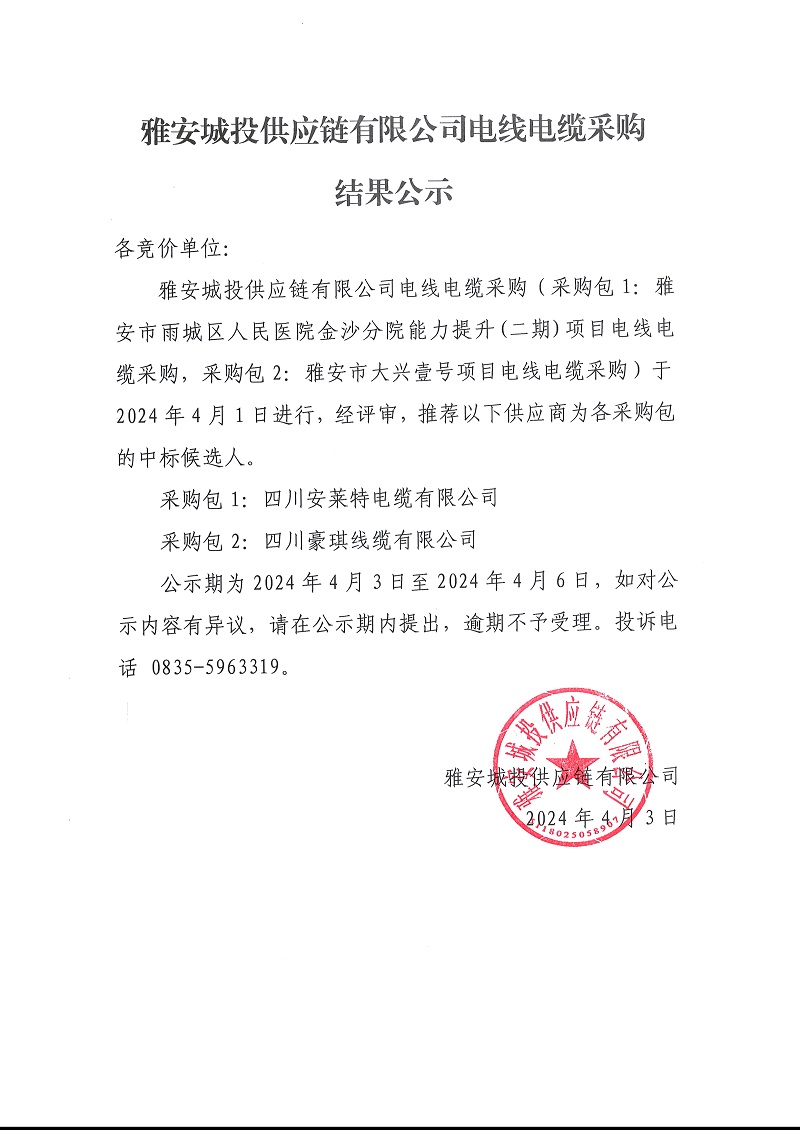 雅安城投供應(yīng)鏈有限公司電線電纜采購結(jié)果公示