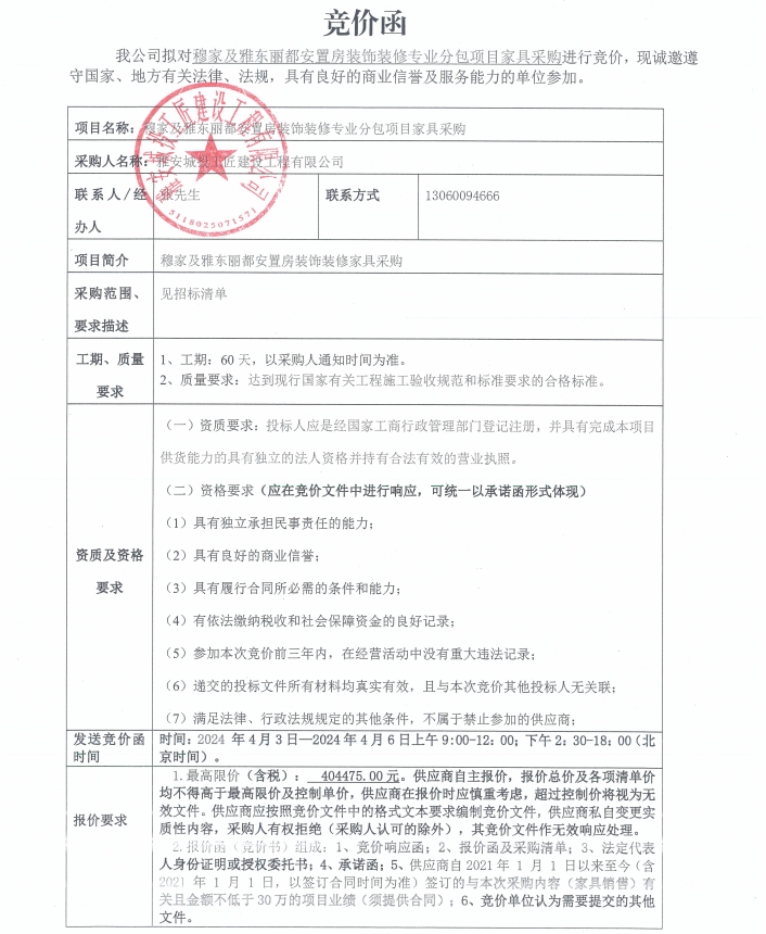 穆家及雅東麗都安置房裝飾裝修專業(yè)分包項(xiàng)目家具采購競價公告