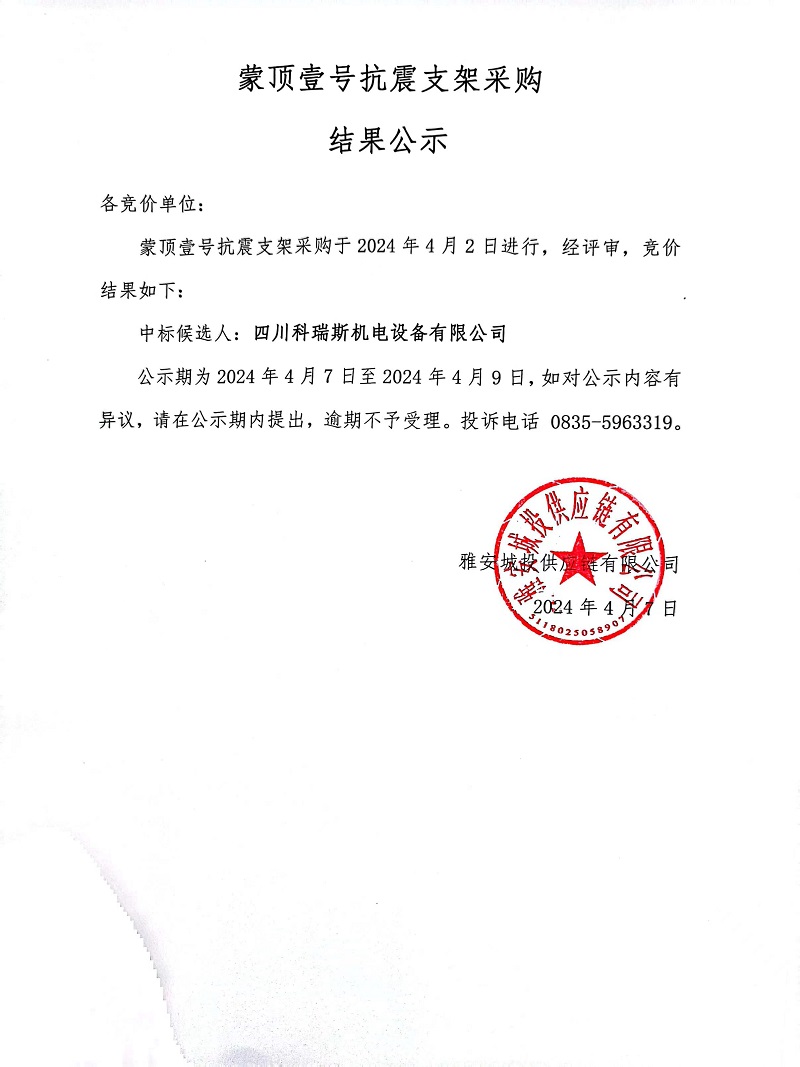 蒙頂壹號抗震支架采購結果公示