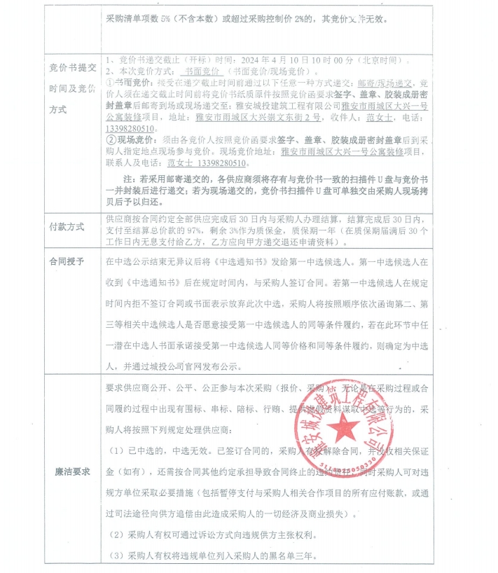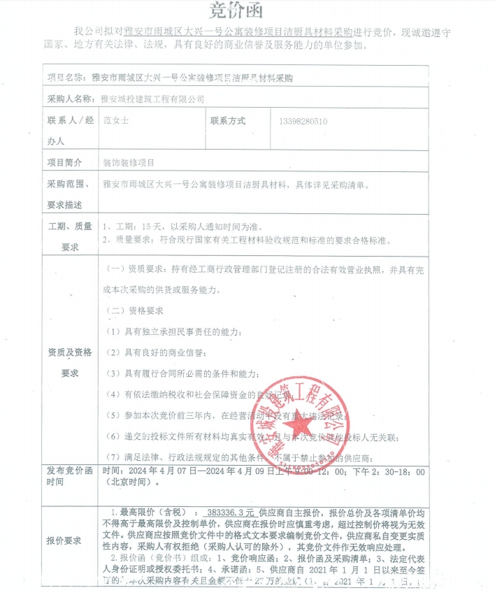 雅安市雨城區(qū)大興一號公寓裝修項目潔廚具材料采購競價公告