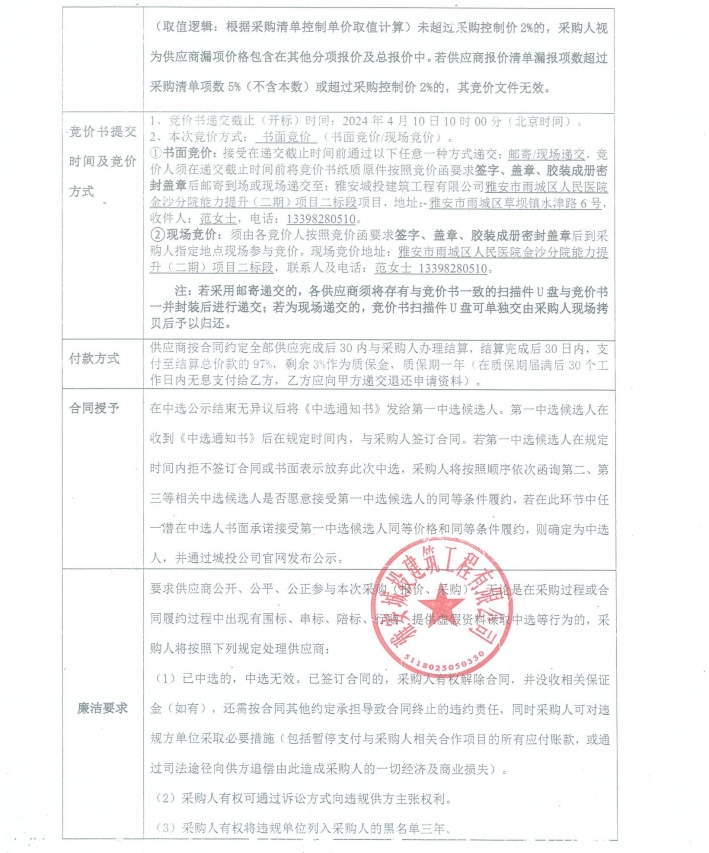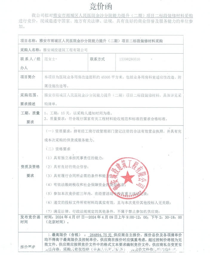 雅安市雨城區(qū)人民醫(yī)院金沙分院能力提升(二期)項目二標段裝修材料采購競價公告