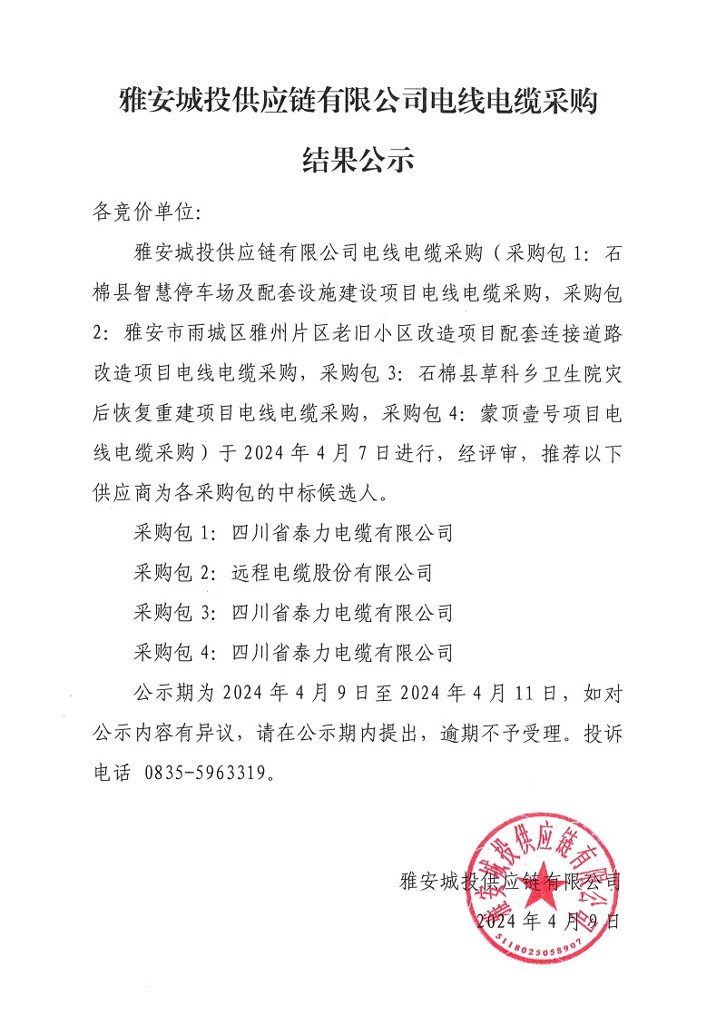 雅安城投供應(yīng)鏈有限公司電線電纜采購(gòu)結(jié)果公示