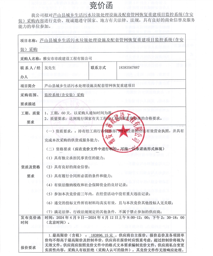 蘆山縣城鄉(xiāng)生活污水垃圾處理設(shè)施及配套管網(wǎng)恢復(fù)重建項(xiàng)目監(jiān)控系統(tǒng)(含安裝)采購(gòu)內(nèi)容競(jìng)價(jià)公告