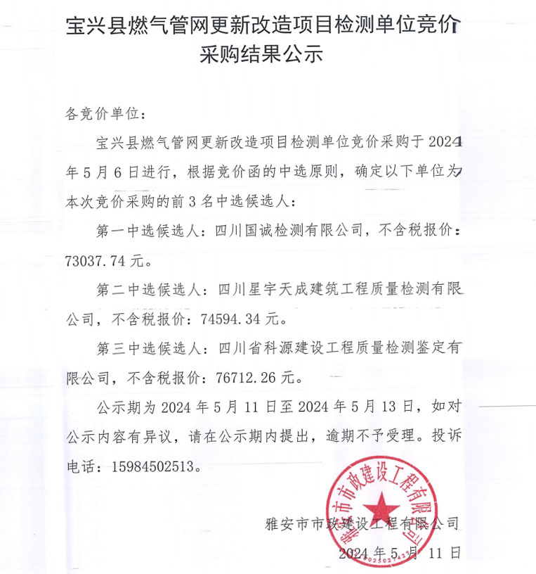 寶興縣燃?xì)夤芫W(wǎng)更新改造項(xiàng)目檢測(cè)單位競采購結(jié)果公示