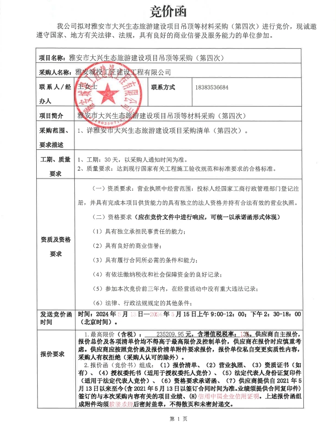 雅安市大興生態(tài)旅游建設(shè)項(xiàng)目吊頂?shù)炔少?gòu)(第四次)競(jìng)價(jià)公告