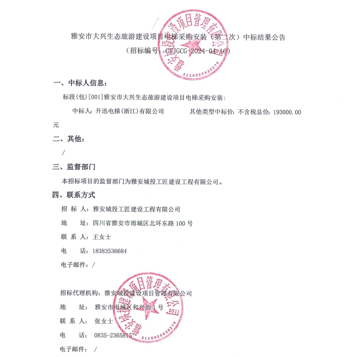 雅安市大興生態(tài)旅游建設(shè)項(xiàng)目電梯采購安裝(第二次)中標(biāo)結(jié)果公告
