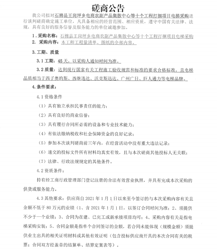 石棉縣王崗坪鄉(xiāng)電商農(nóng)副產(chǎn)品集散中心等十個工程打捆項目電梯采購磋商公告