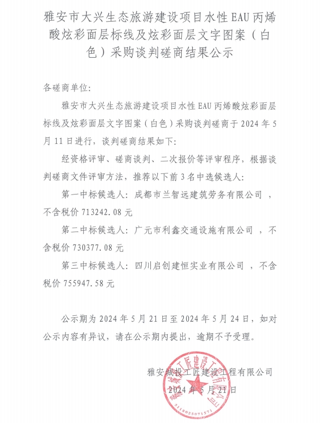 雅安市大興生態(tài)旅游建設(shè)項目水性EAU丙烯酸炫彩面層標(biāo)線及炫彩面層文字圖案(白色)采購談判磋商結(jié)果公示