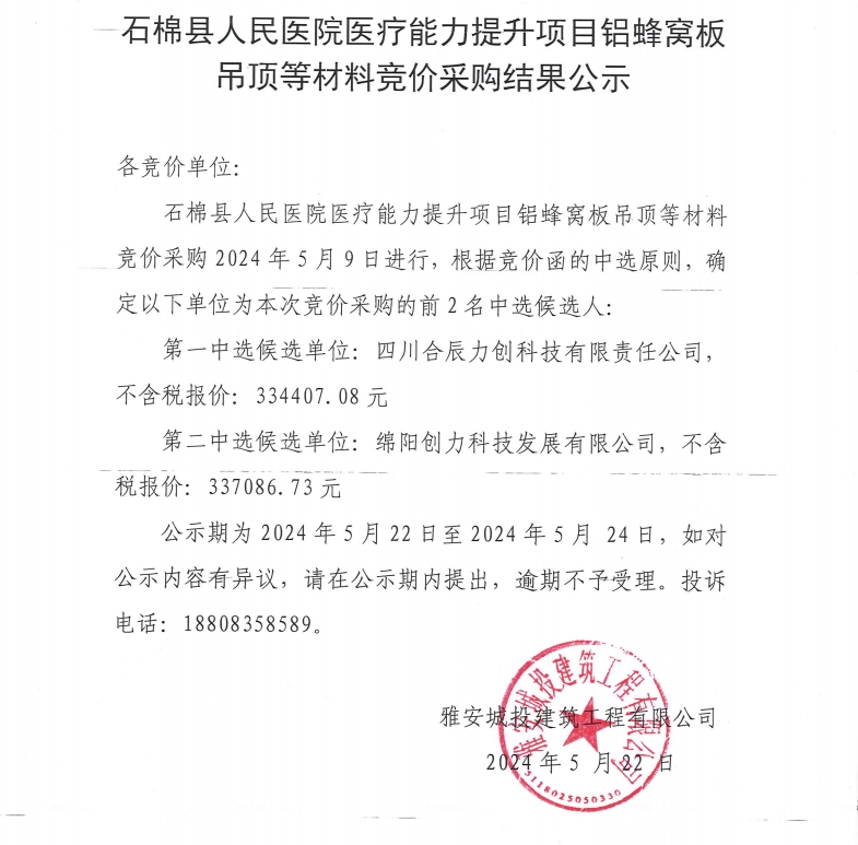 石棉縣人民醫(yī)院醫(yī)療能力提升項目鋁蜂窩板吊頂等材料競價采購結果公示