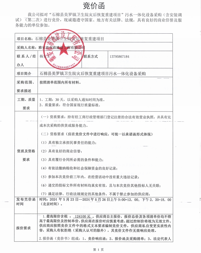 石棉縣美羅鎮(zhèn)衛(wèi)生院災(zāi)后恢復(fù)重建項(xiàng)目污水一體化設(shè)備材料采購(gòu)(第二次)競(jìng)價(jià)公告