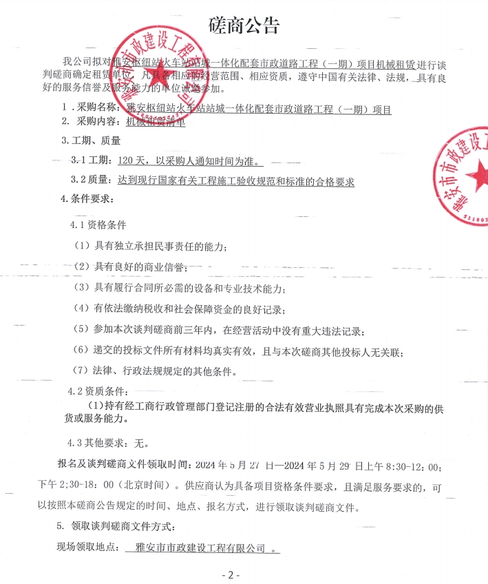 雅安樞紐站火車(chē)站站城一體化配套市政道路工程(一期)項(xiàng)目機(jī)械租賃磋商公告
