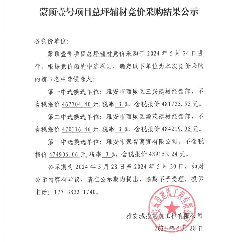 蒙頂壹號項目總坪輔材競價采購結(jié)果公示