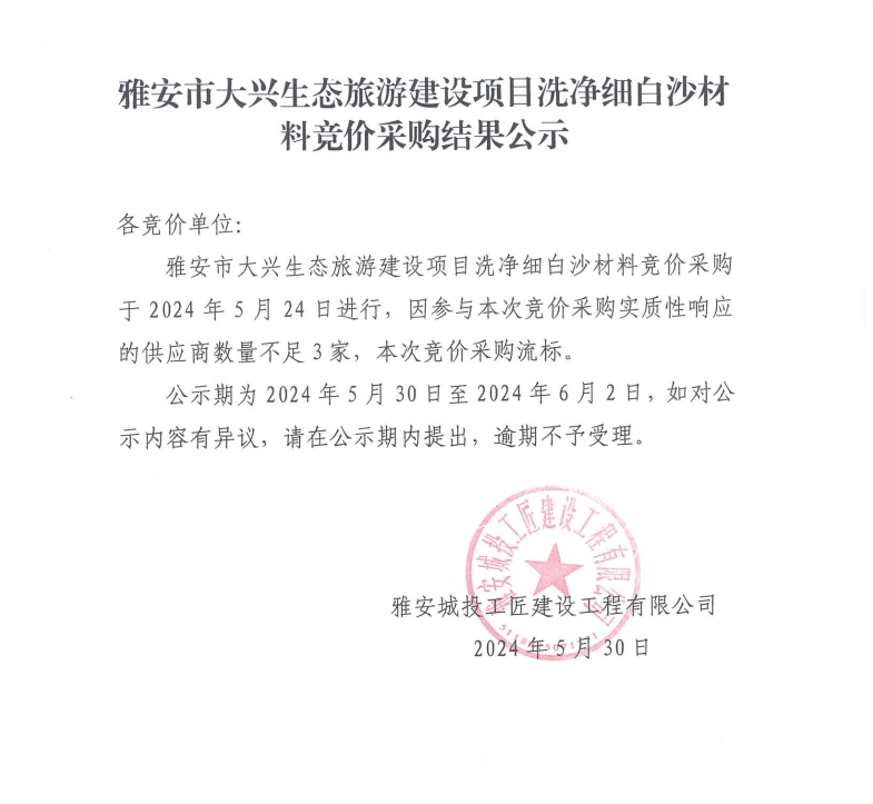 雅安市大興生態(tài)旅游建設(shè)項目洗凈細白沙材料競價采購結(jié)果公示