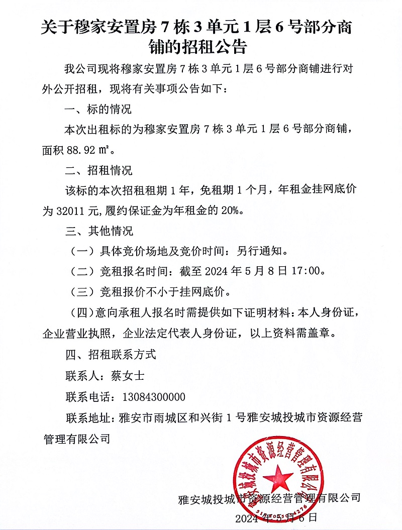 關于穆家安置房7棟3單元1層6號部分商鋪的招租公告