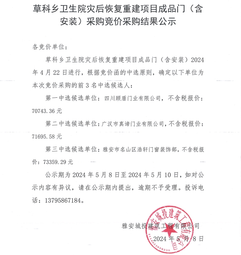 草科鄉(xiāng)衛(wèi)生院災(zāi)后恢復(fù)重建項(xiàng)目成品門(含安裝)采購競價(jià)采購結(jié)果公示