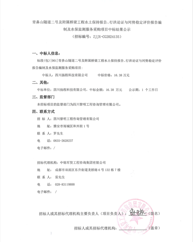 青鼻山隧道二號及附屬橋梁工程水土保持報告、行洪論證與河勢穩(wěn)定評價報告編制及水保監(jiān)測服務采購項目中標結果公示