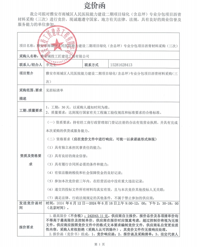 雅安市雨城區(qū)人民醫(yī)院能力建設二期項目綠化(含總坪)專業(yè)分包項目瀝青材料采購(三次)競價公告