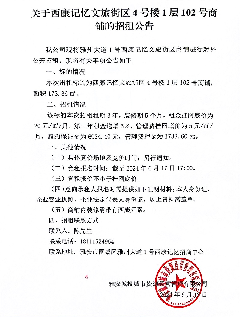 關于西康記憶文旅街區(qū)4號樓1層102商鋪的招租公告