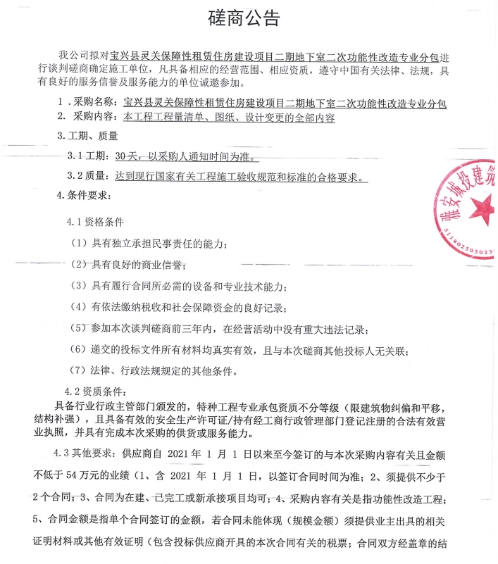 寶興縣靈關(guān)保障性租賃住房建設(shè)項(xiàng)目二期地下室二次功能性改造專業(yè)分包談判磋商公告