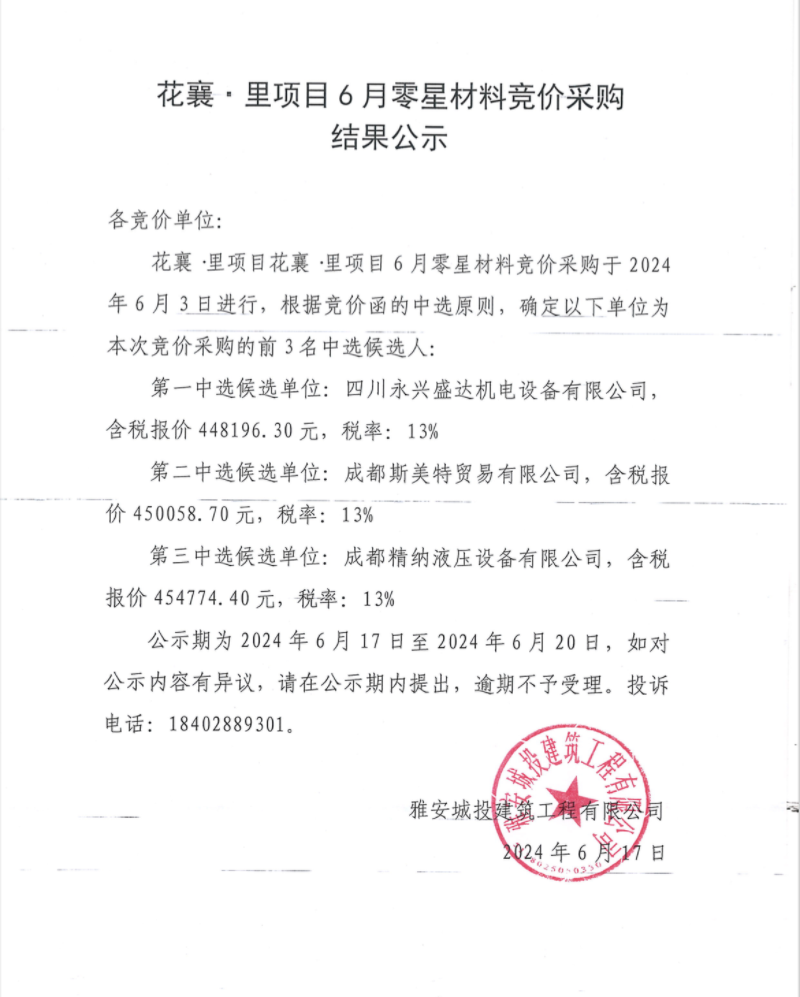 花襄·里項(xiàng)目6月零星材料競(jìng)價(jià)采購結(jié)果公示
