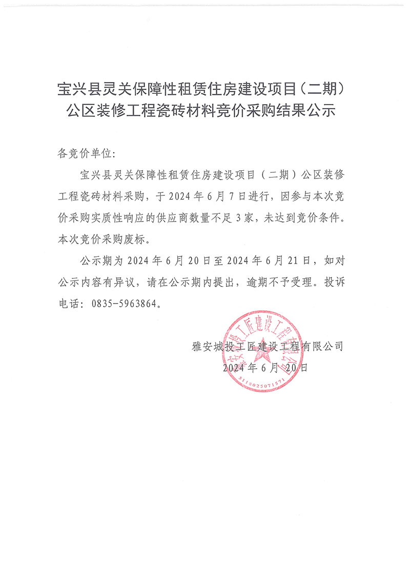 寶興縣靈關(guān)保障性租賃住房建設(shè)項(xiàng)目(二期)公區(qū)裝修工程瓷磚材料競價(jià)采購結(jié)果公示