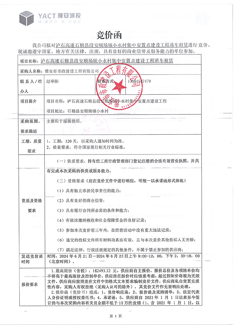 瀘石高速石棉縣段安順場鎮(zhèn)小水村集中安置點(diǎn)建設(shè)工程吊車租賃競價(jià)函