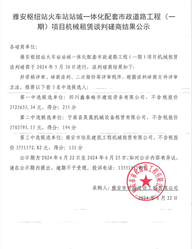 雅安樞紐站火車站站城一體化配套市政道路工程(一期)項目機械租賃談判磋商結果公示