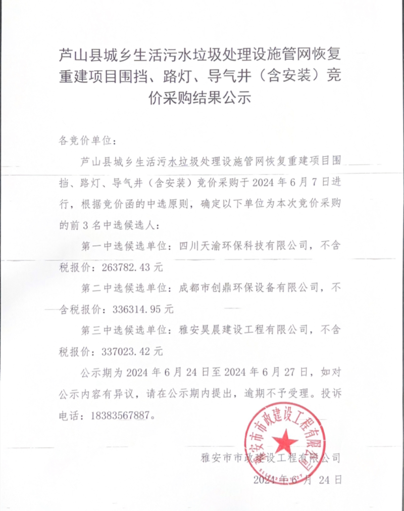 蘆山縣城鄉(xiāng)生活污水垃圾處理設(shè)施管網(wǎng)恢復(fù)重建項(xiàng)目圍擋、路燈、導(dǎo)氣井(含安裝)競(jìng)價(jià)采購(gòu)結(jié)果公示