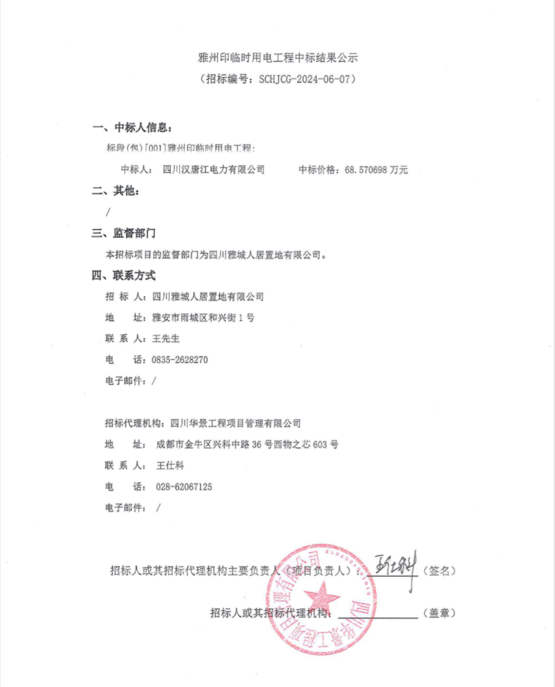 雅州印臨時用電工程中標(biāo)結(jié)果公示