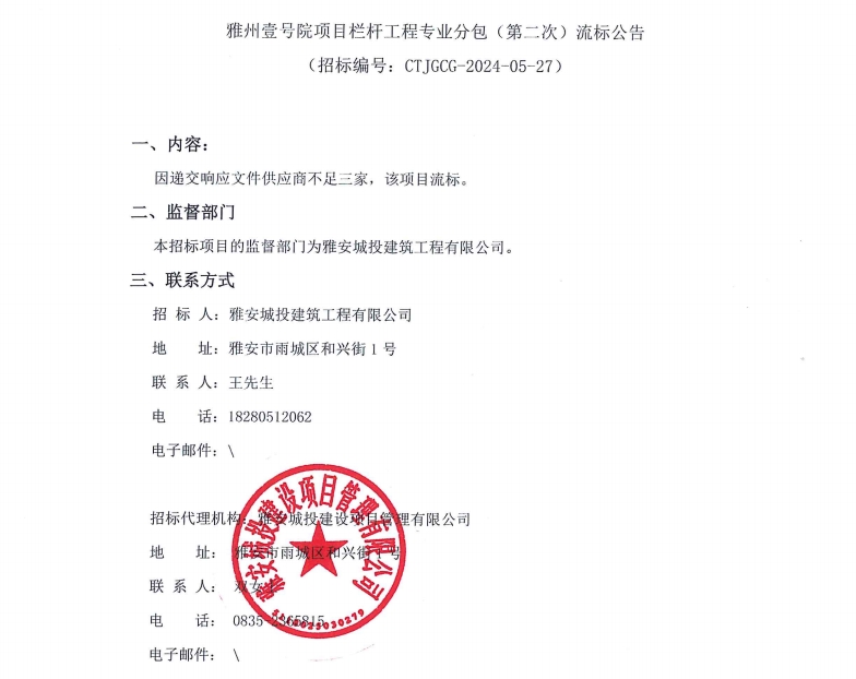 雅州壹號(hào)院項(xiàng)目欄桿工程專業(yè)分包(第二次)流標(biāo)公告