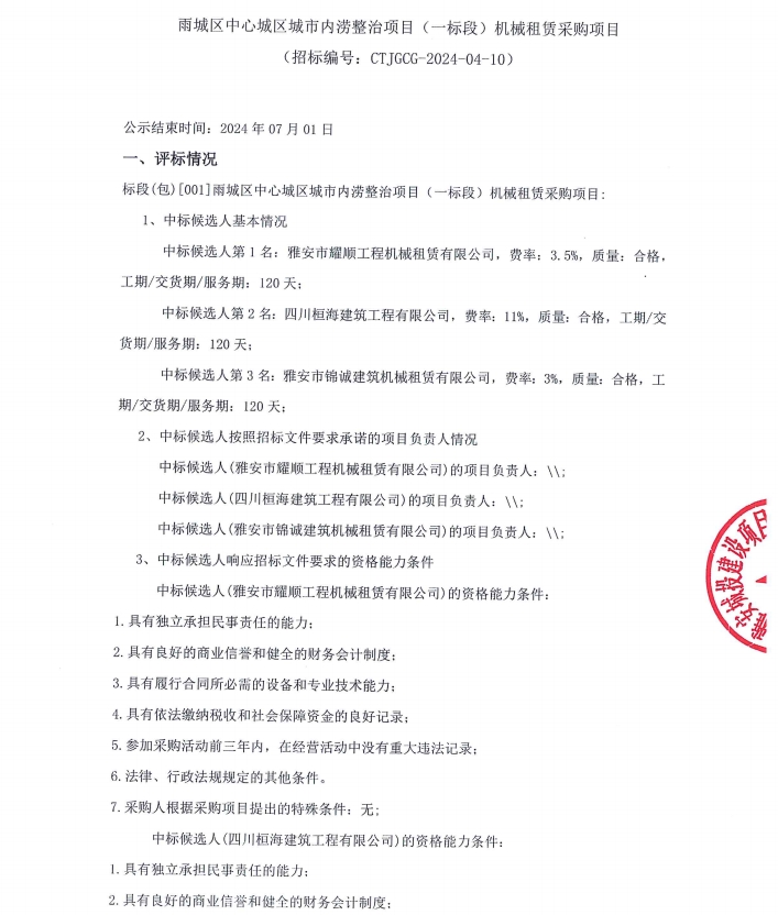 雨城區(qū)中心城區(qū)城市內(nèi)澇整治項目(一標段)項目機械租賃采購項目公示