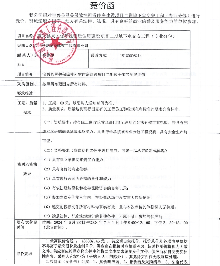 寶興縣靈關(guān)保障性租賃住房建設(shè)項目二期地下室交安工程(專業(yè)分包)競價公告