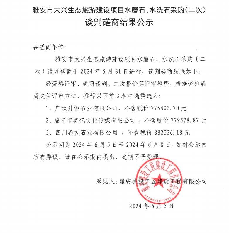 雅安市大興生態(tài)旅游建設(shè)項(xiàng)目水磨石、水洗石采購(二次)談判磋商結(jié)果公示