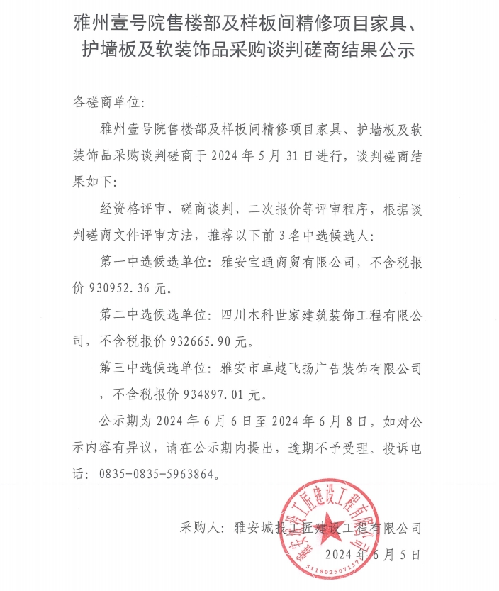 雅州壹號(hào)院售樓部及樣板間精修項(xiàng)目家具、護(hù)墻板及軟裝飾品采購談判磋商結(jié)果公示