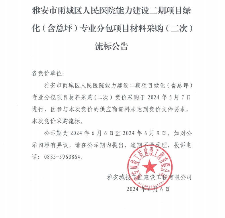 雅安市雨城區(qū)人民醫(yī)院能力建設(shè)二期項目綠化(含總坪)專業(yè)分包材料采購(二次)流標(biāo)公告