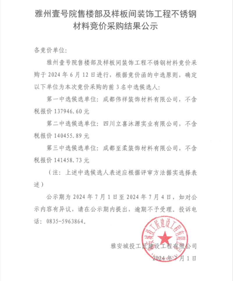 雅州壹號院售樓部及樣板間裝飾工程不銹鋼材料競價采購結(jié)果公示
