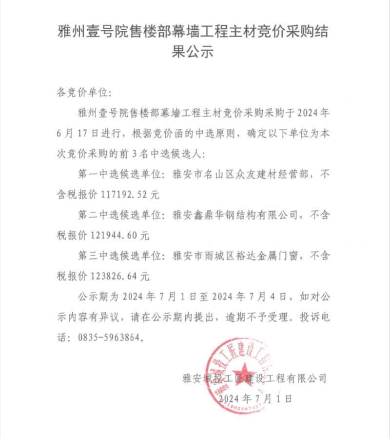 雅州壹號(hào)院售樓部幕墻工程主材競價(jià)采購結(jié)果公示