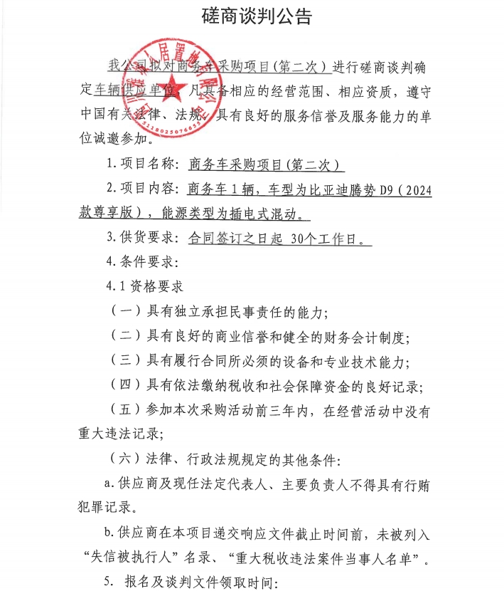 商務(wù)車采購項(xiàng)目(第二次)磋商談判公告