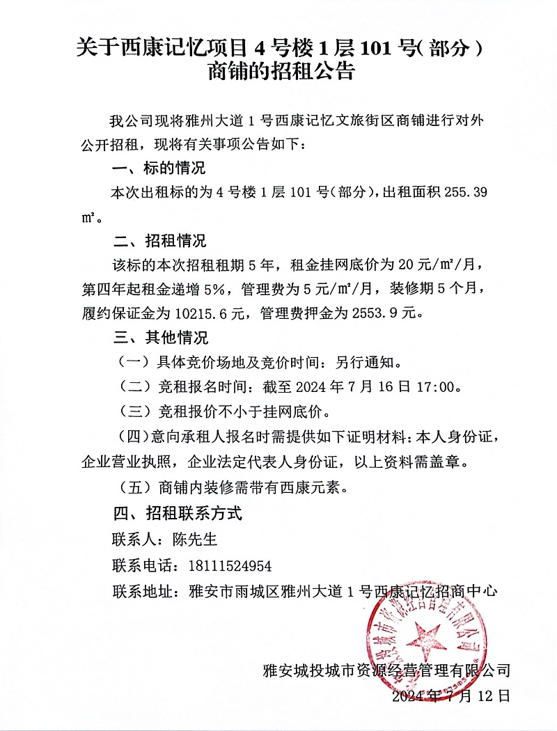 關于西康記憶項目4號樓1層101號(部分)商鋪的招租公告