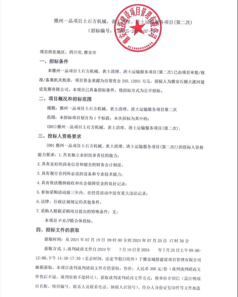 雅州一品項(xiàng)目土石方機(jī)械、表土清理、渣土運(yùn)輸服務(wù)項(xiàng)目(第二次)公告