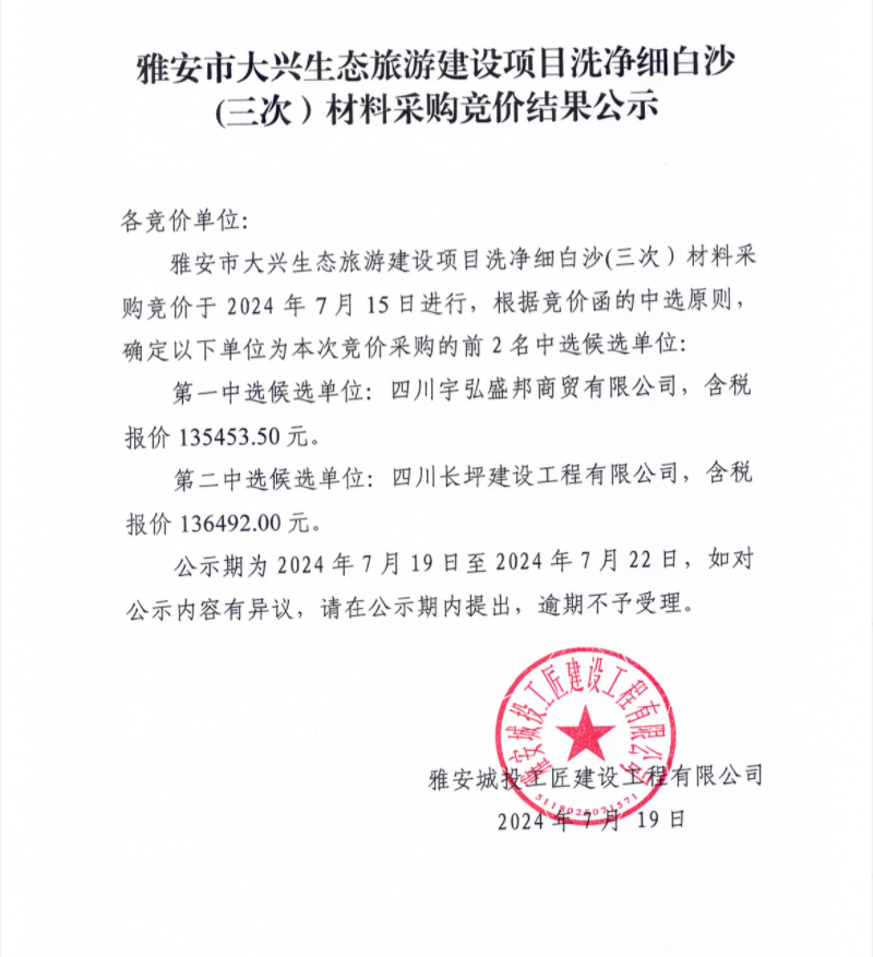 雅安市大興生態(tài)旅游建設(shè)項目洗凈細(xì)白沙(三次)材料采購競價結(jié)果公示