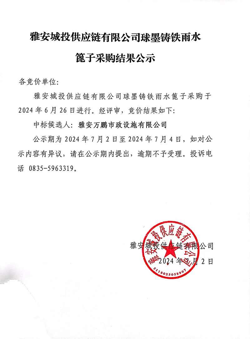 雅安城投供應(yīng)鏈有限公司球墨鑄鐵雨水篦子采購結(jié)果公示