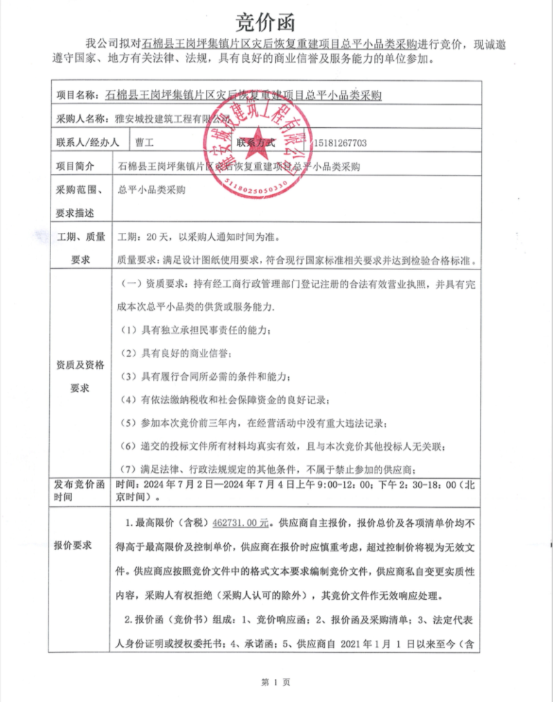 石棉縣王崗坪集鎮(zhèn)片區(qū)災(zāi)后恢復(fù)重建項(xiàng)目總平小品類采購(gòu)競(jìng)價(jià)公告