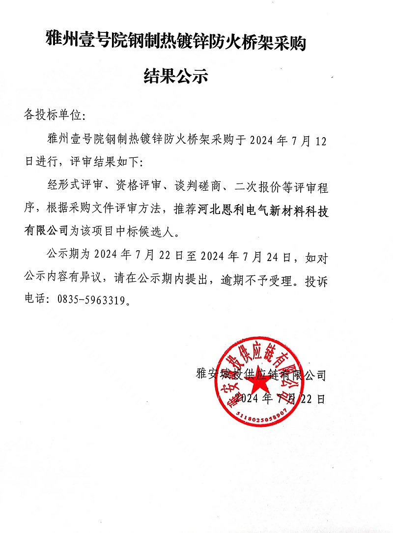 雅州壹號院鋼制熱鍍鋅防火橋架采購結(jié)果公示