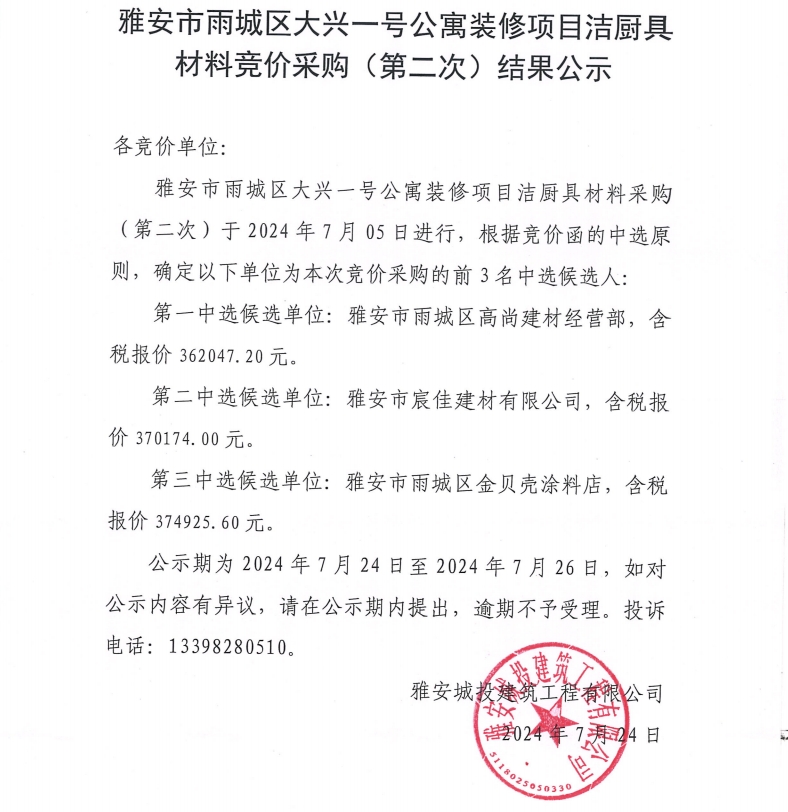 雅安市雨城區(qū)大興一號公寓裝修項目潔廚具材料競價采購(第二次)結(jié)果公示