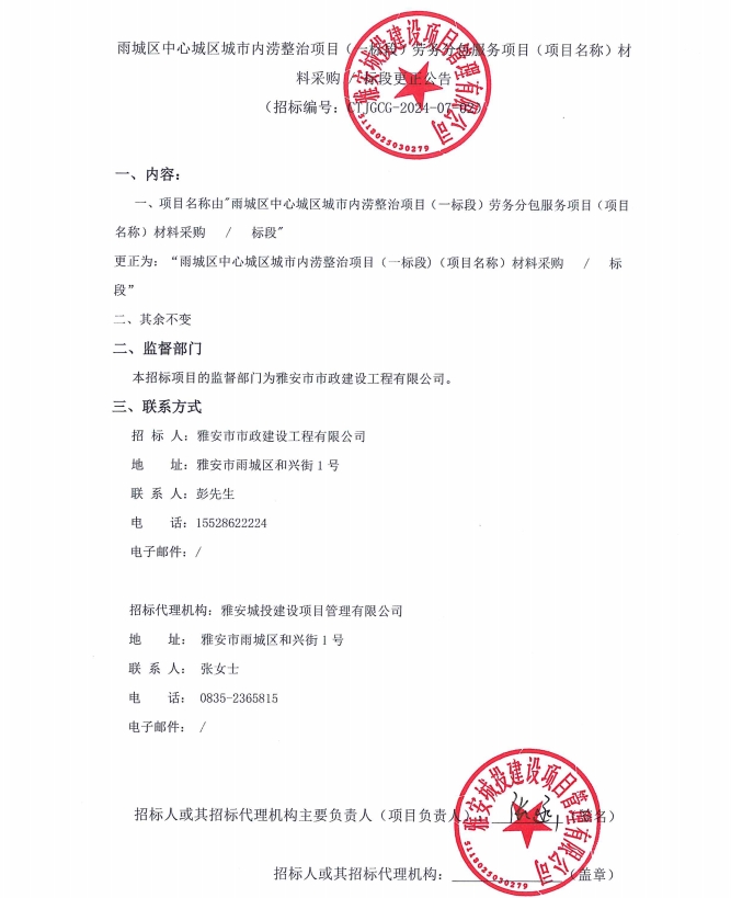 雨城區(qū)中心城區(qū)城市內(nèi)澇整治項目(一標段)勞務(wù)分包服務(wù)項目(項目名稱)材料采購/標段更正公告
