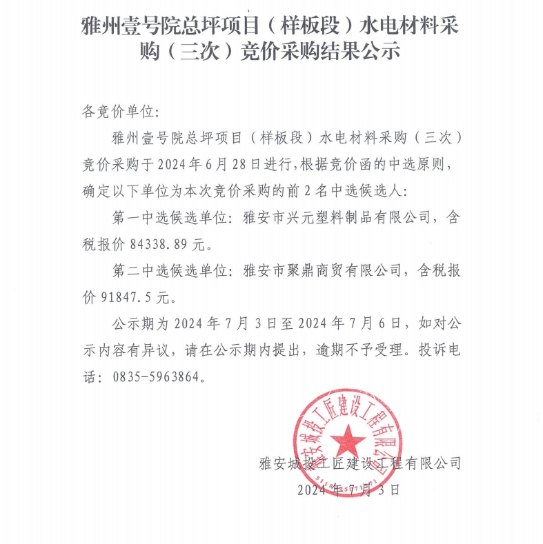 雅州壹號(hào)院總坪項(xiàng)目(樣板段)水電材料采購(gòu)(三次)競(jìng)價(jià)采購(gòu)結(jié)果公示